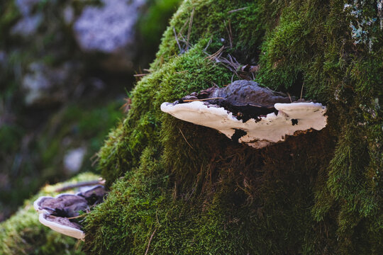 dark gray belted bracket fungus on moss covered tree stump. Ganoderma sp. or Fomitopsis sp.