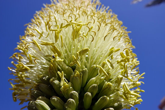 Agave Attenuata or Swan's Neck Agave spike bent over by its own weight, against a blue sky
