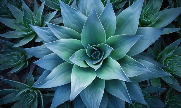 Blue agave leaves, succulent gardening in California, USA. Home garden design, yucca, century plant or aloe. Natural botanical ornamental mexican houseplants, arid desert floriculture. Calm atmosphere