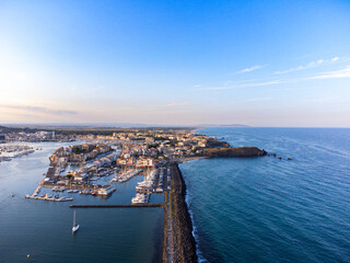 Aerial view of the Cap d'Agde sea resort on the South of France along the Mediterranean Sea - Rocky cape from above