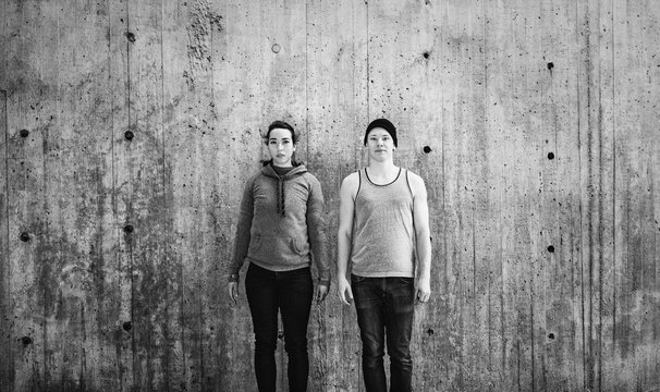 Young woman and man standing in front of concrete wall, Sweden, Europe