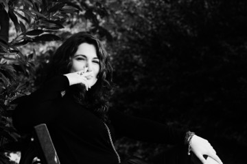 Middle-aged woman smiling with wine in garden atmosphere