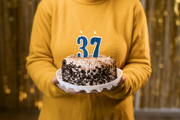 Businesswoman celebrates her 37th birthday with colleagues, blowing out candles on a cake in an office setting.