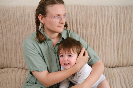 Portrait of an adult woman with a crying baby sitting on a sofa, female age 37 years and male two years