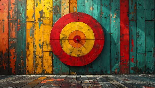A vibrant, weathered wooden background with multi-colored planks hosts a bullseye target, casting a shadow