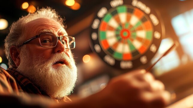 An elderly man enjoying a game of darts with enthusiasm in a lively, warmly-lit pub setting, symbolizing recreation and social engagement in golden years.