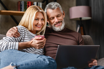 Happy beautiful middle aged couple using laptop and smiling while resting on couch at home