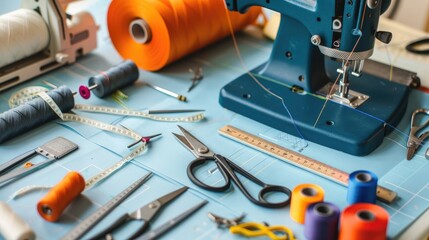 pattern, scissors, tape measure, and a sewing machine. Workplace of seamstress. Dressmaker cuts dress detail on the sketch lines.