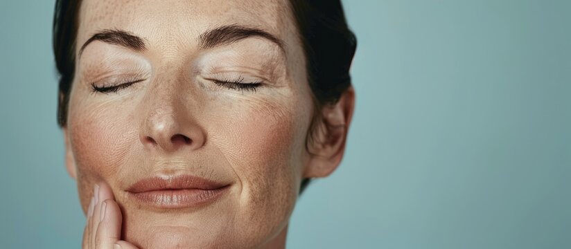A beautiful middle aged woman with her eyes closed and a gentle touch embodies beauty and skincare ideals Perfect for skincare ads isolated on a bright background with copy space image