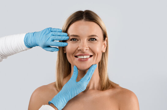 Preparing for cosmetic surgery with smiling woman and surgeon