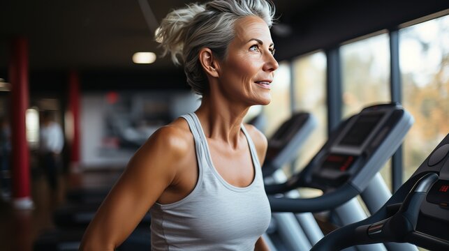 middle aged woman doing a spinning class at a gym. aged woman working out exercising on a treadmill in a gym. mood fun.