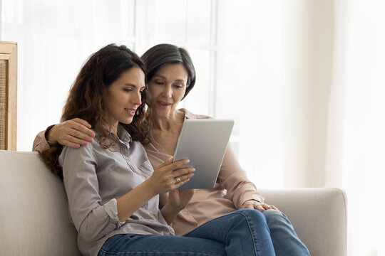 Middle-aged man and woman collaborating on digital device with love icons