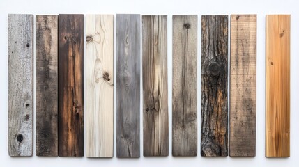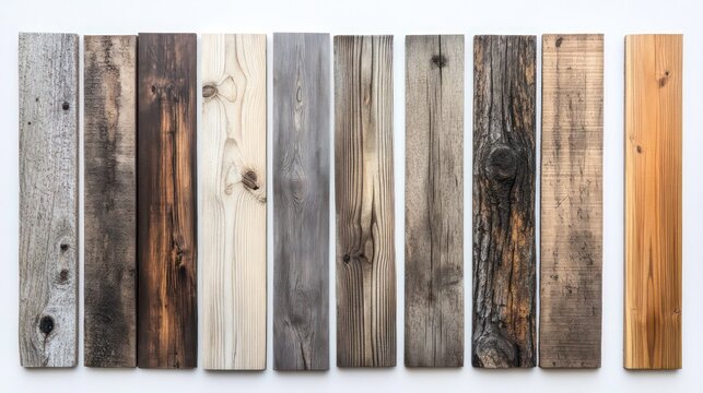 Collection of various wood planks with different colors and textures arranged in a row on a white background.