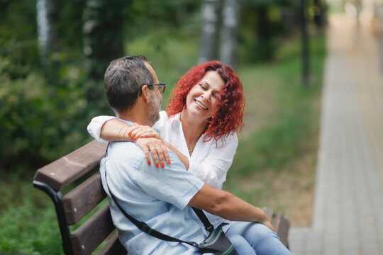 red-haired pretty woman hugs slender man with glasses. Cute middle aged european couple on park bench.