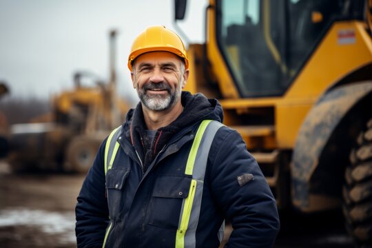 Portrait of a middle aged male heavy machinery driver on construction site