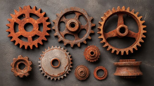 Vintage rusted gears and cogs arranged artfully on a textured surface showcasing industrial aesthetics and aged charm
