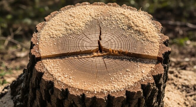 Tree Stump with Annual Growth Rings – Close-up of Cut Wood and Sawdust Outdoors