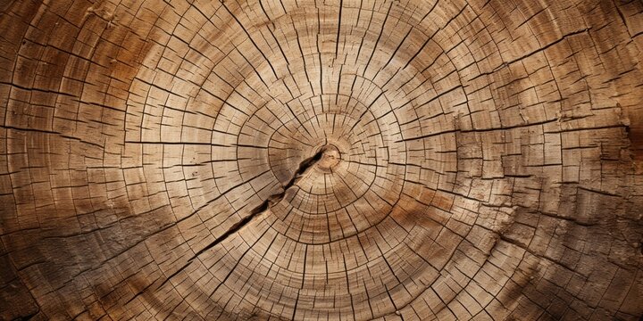 A closeup macro of a natural old wood texture reveals the brown circular rings and timber pattern on the cut surface of a forest tree stump cross section