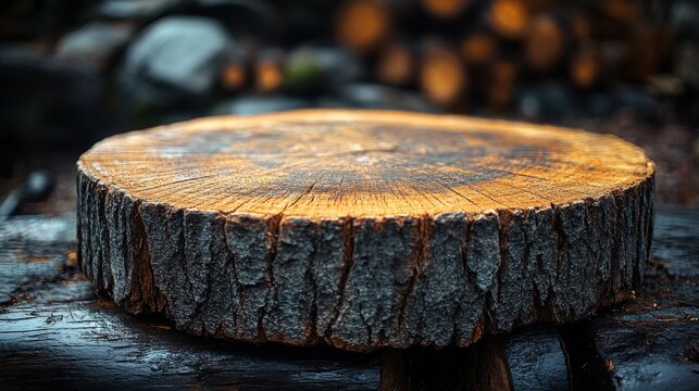 Rustic wooden slice, tree stump, natural texture, wood grain, background.