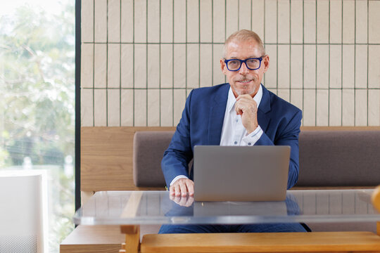 Cheerful asian businessman working from home on laptop