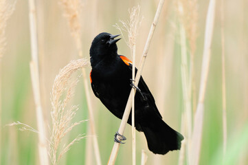 A male red-winged blackbird calling.; Wellfleet, Cape Cod, Massachusetts.