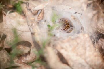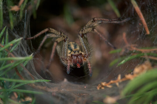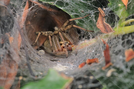 Labyrinth spider (Agelena labyrinthica), from the family of funnel spiders, sitting in a tunnel from its web, macro photography of a spider in a natural habitat, Kiev, Ukraine