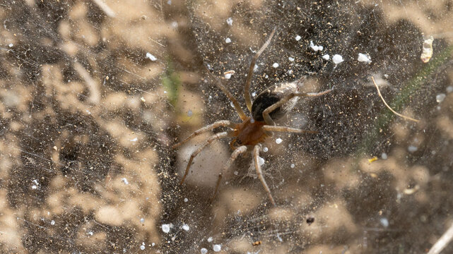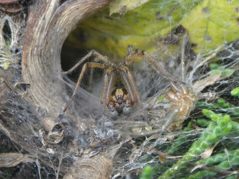 Closeup of a Agelena labyrinthica spider walking in its cobweb