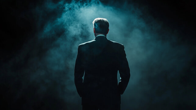 back view of mysterious unknown gangster criminal mafia person wearing black business suit in dark mystery smoky background