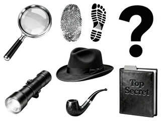 Detective Mystery Illustration: Magnifying Glass, Footprint, Question Mark, Hat, Torch