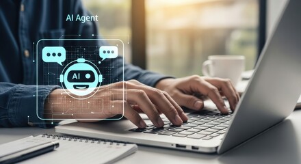 Photo of a man types on a laptop with a digital ai agent interface displayed above the keyboard