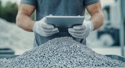 Close-up of a worker with gloves using a tablet to inspect gravel or aggregate materials, highlighting digital advancements in quality control within the construction industry.