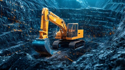 Heavy equipment digging out a large plot of land, depth of excavation visible, tech overlay showing real-time data, hyper-realistic style, natural light with shadows