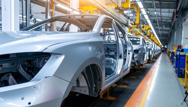 An automotive manufacturing line of vehicles. The vehicles are in various stages of completion, showcasing the process