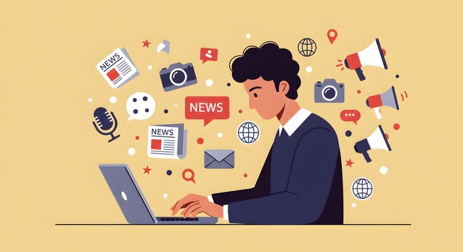 Focused Flat Design:  Modern News Journalist Working on Laptop