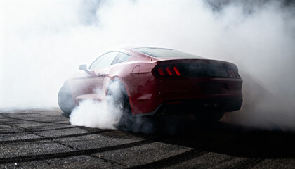 Red V8 sports car spinning through dense tire smoke, dramatic and high-energy.