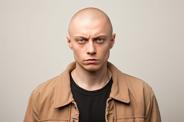 portrait of an aggressive man with shaved head and casual clothes, on a light background