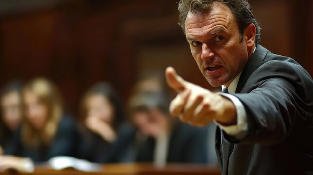 A passionate scene showing an angry businessman pointing aggressively during a heated discussion in a courtroom, highlighting intense human emotions and confrontation.