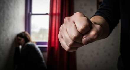 Close-up of a fist advances towards a woman who is cowering in a room corner.