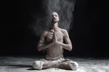 A yoga teacher sits in a sukhasana on a black background.