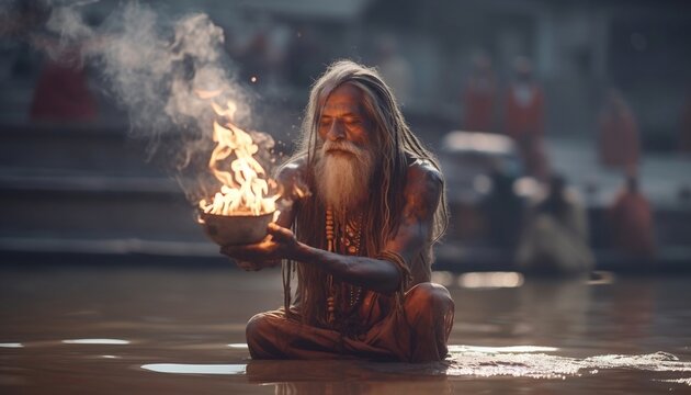 Aghori Monk Sitting in a Holy River in India Generative AI