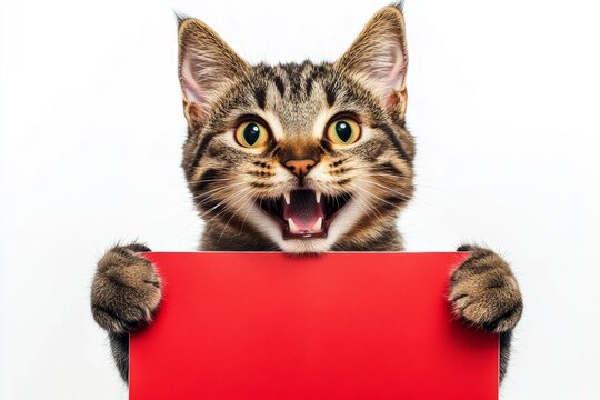 Сute adult cat manx hold in front paws a concept - large red drive sign. Cat photo ad. Isolated cat on a solid outfit pure white background. Kitten ad visual. Creature photo for brand.