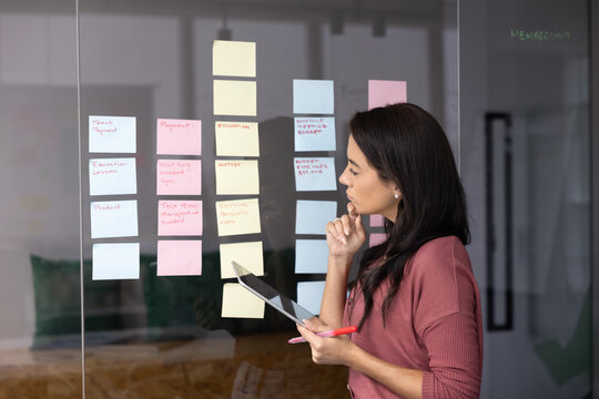 Collaborating on glass wall with sticky notes, tablet and data charts for team planning