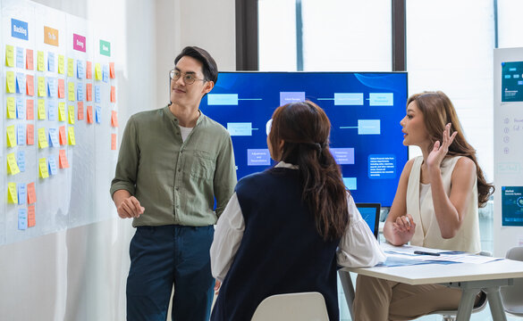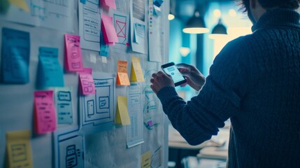 brainstorming session, using sticky notes on a task board (kanban) to organize ideas and workflow in a modern office