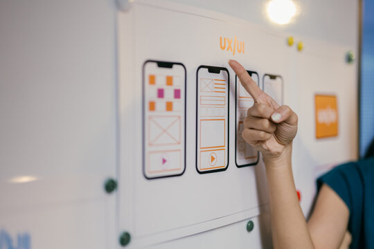 Web designer is pointing at a whiteboard and showing the different stages of development of a mobile application. She is explaining the process to her team