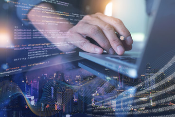 Hands typing on laptop amidst digital graphics representing agile project management and modern technology concepts. Asymptotic smart data analytic.