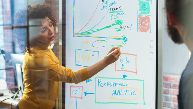 Positive Businesswoman Making a Team Presentation in a Meeting Room in Creative Office. Excited Arab Female Discussing a New Project Plan on Digital Whiteboard Display