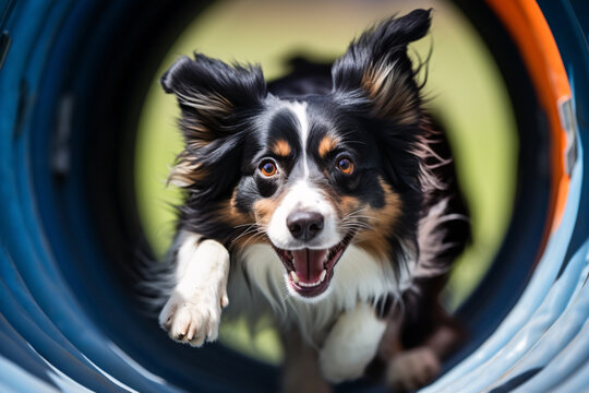 Border Collie dog running through agility tunnel