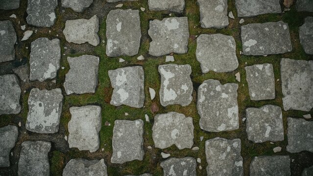 Fragmented surface of cobblestones covered with moss, highlighting the concept of natural wear and aging.