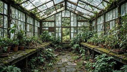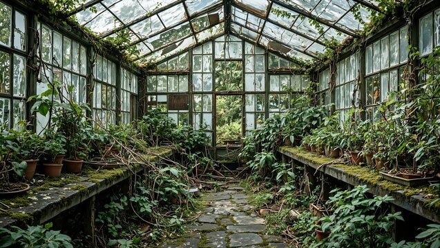 Abandoned greenhouse with shattered glass overgrown plants and moss covered stone floor