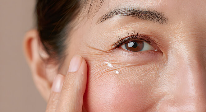 Asian woman applying white eye cream under eyes with finger. Skincare beauty routine eye care anti aging treatment moisturizing cosmetic dermatology wellness